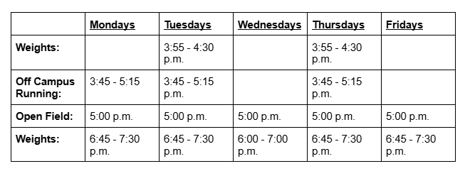 The BHS Track & Field and Cross Country coaches will be facilitating open field sessions and general weight training for all interested community members through the winter season. Open field will take place daily at 5:00 p.m. at the south end of the stadium bleachers. Off campus runs are offered Mondays, Tuesdays, and Thursdays. Weight training times vary by day. See the full schedule below for details. (Open field and weight training may be canceled on school holidays.)
